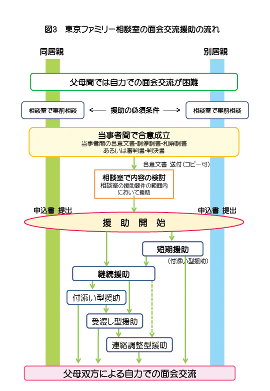 図3の「東京ファミリー相談室の面会交流援助の流れ」にあるとおり、離婚を考える段階、離婚の調停中、訴訟中、