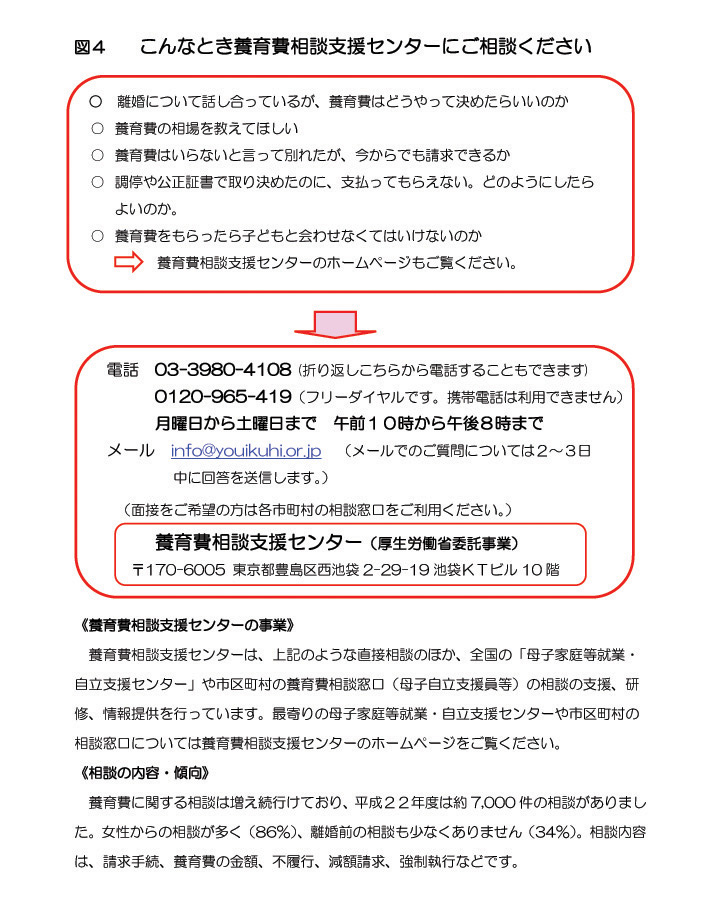 養育費に関する一切の相談や質問を待っていますから、図4の「こんなとき養育費相談支援センターにご相談ください」をご覧ください。